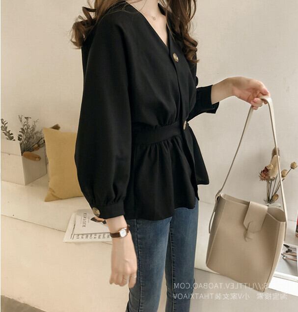 Vネック ブラウス トップス 長袖 シャツ ゴムウエスト 3カラー a309