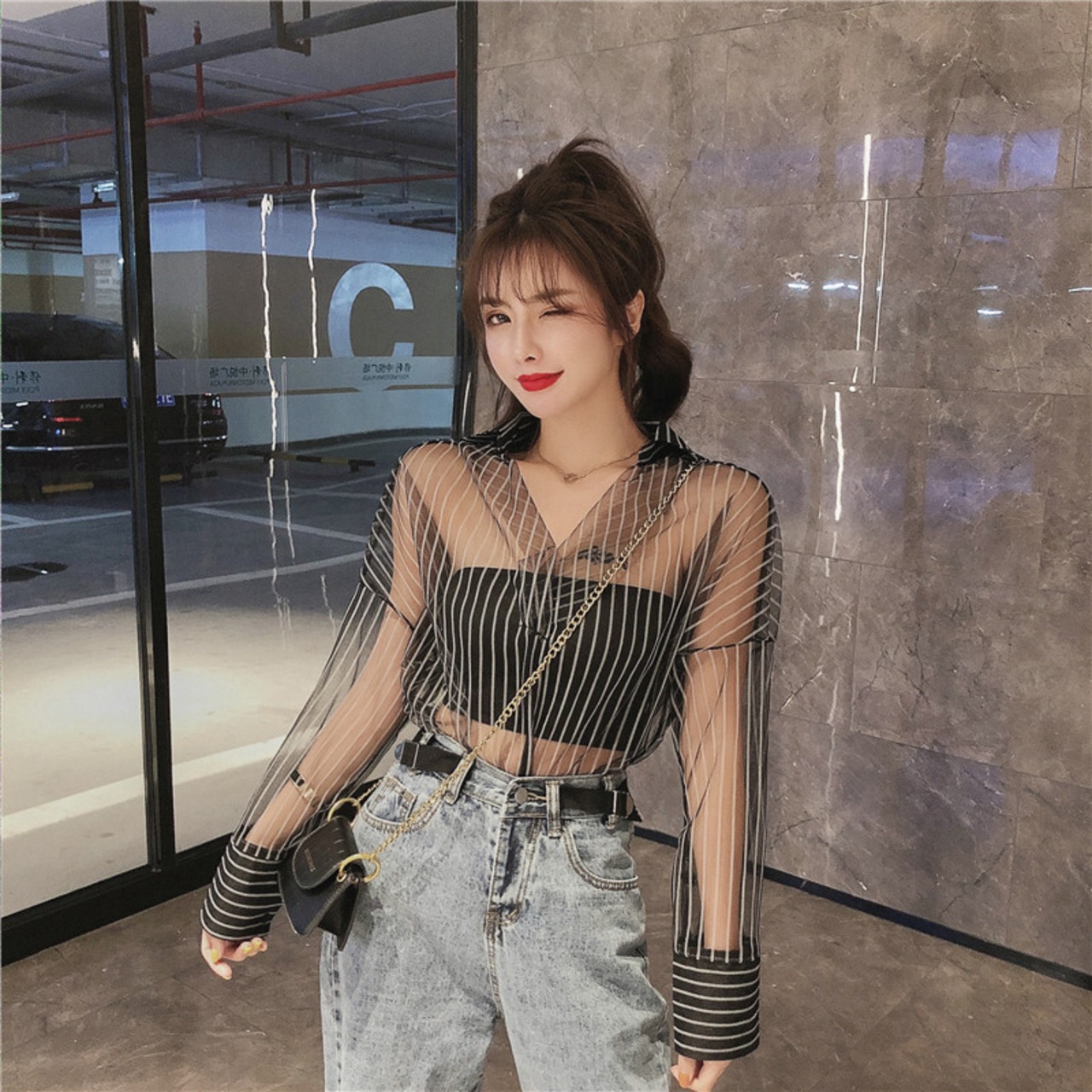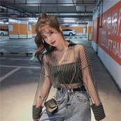セクシー トップス+ベアトップ Vネック カシュクール ストライプ柄 シースルー ゆったり A337