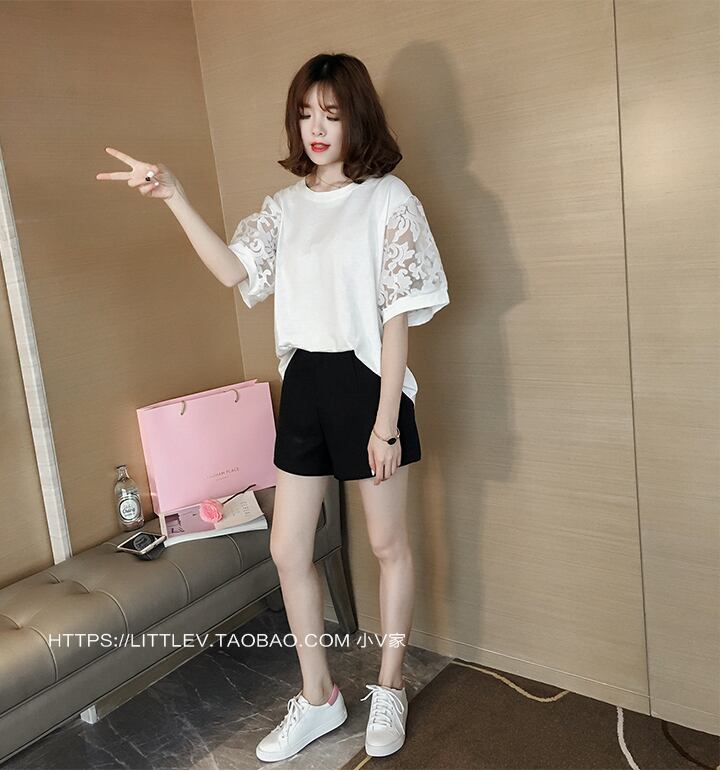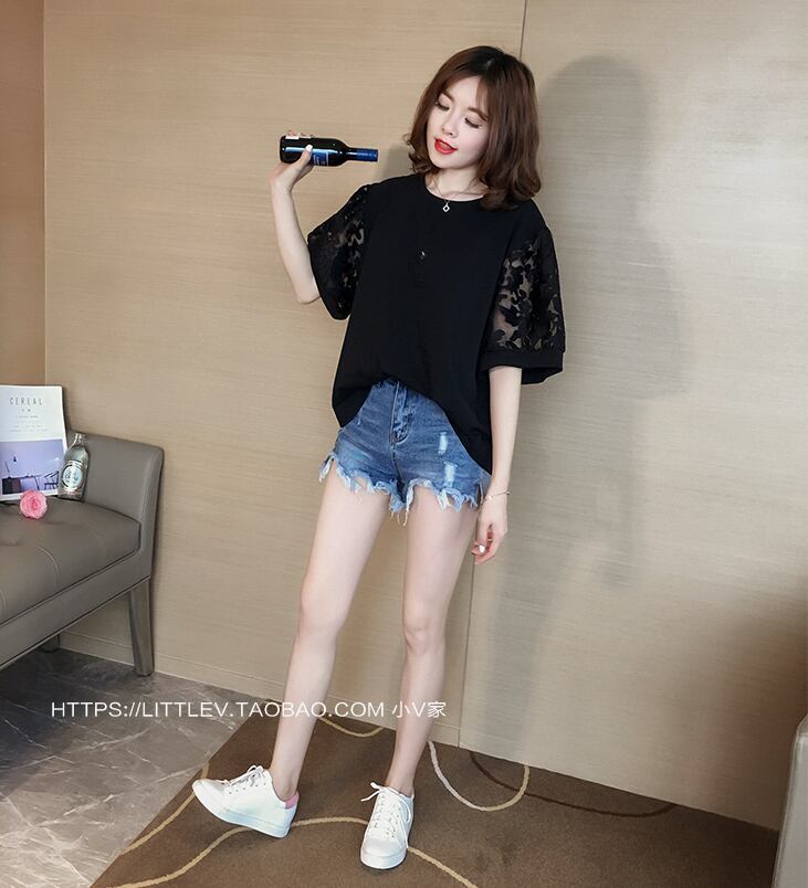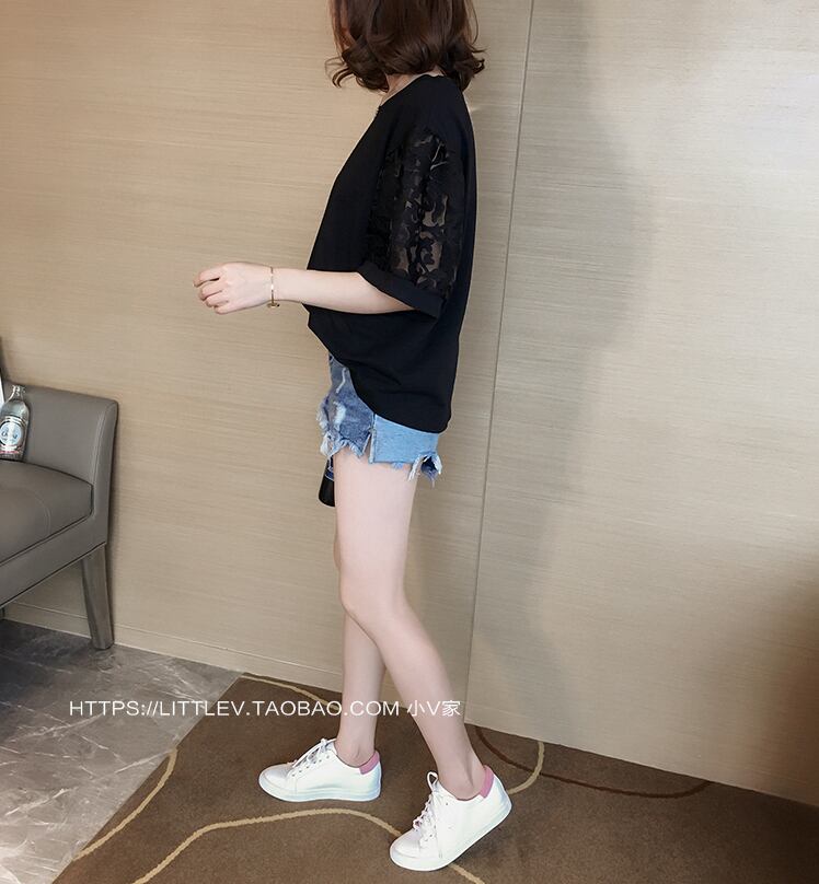 メッシュレースステッチ 半袖 Tシャツ 花柄 ラウンドネック トップス 3カラー a411