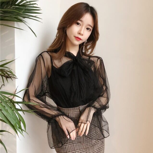 【セット】キャミソール+シフォンブラウス リボン トランペットスリーブ シースルー袖 a428