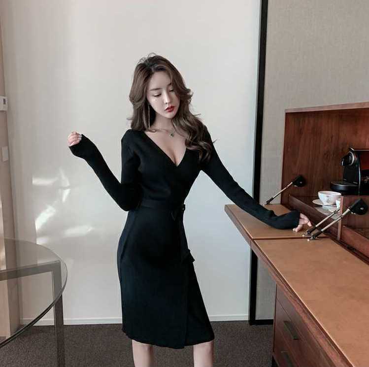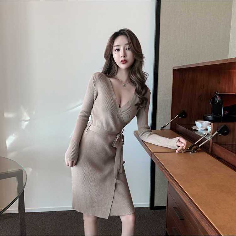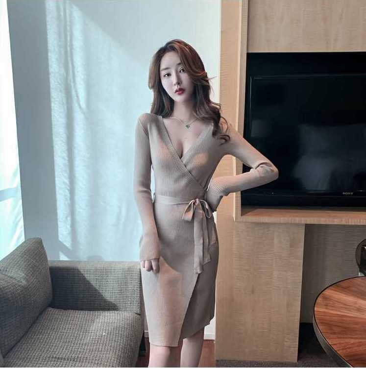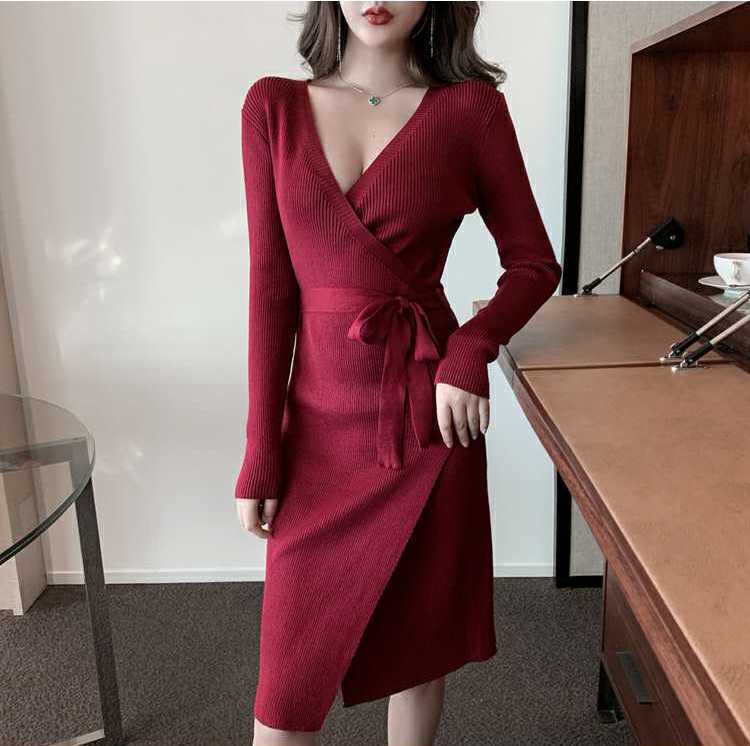Vネック ニットワンピース ウエストリボン フェミニン タイトワンピ 3カラー a424