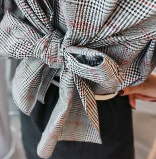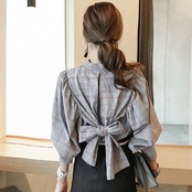 大きなバックリボンが印象的なチェック柄長袖シャツです。
