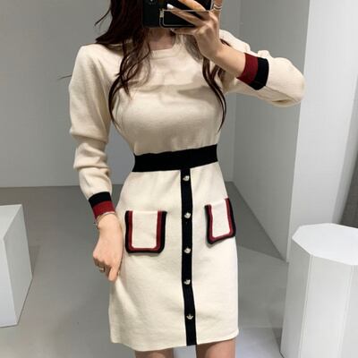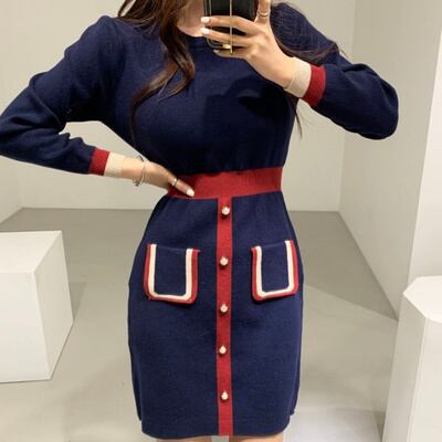 レトロ ニットワンピース バイカラー ミドル丈 2カラー a429