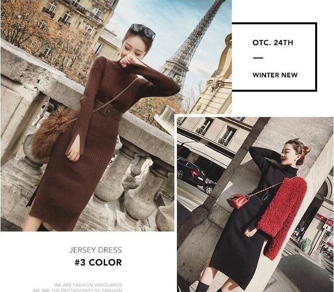 ハイネック ニットワンピース タイトワンピ ウエストベルト 長袖 スリット 3カラー a432
