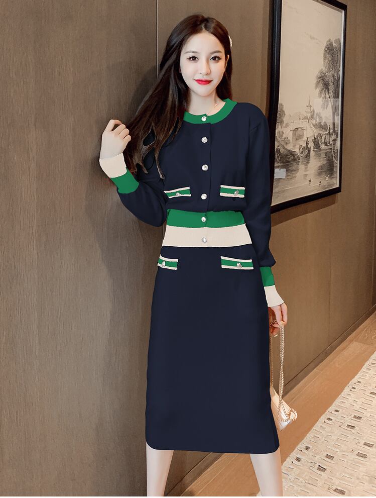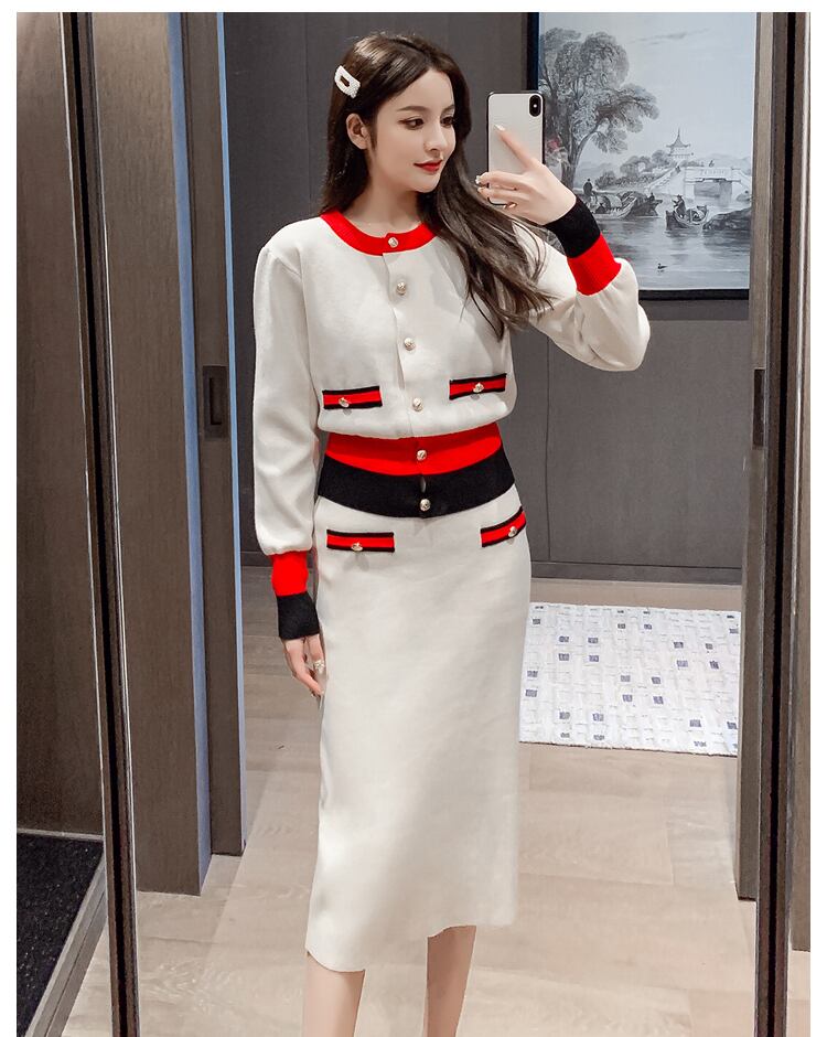 【セットアップ】ニットカーディガン+ニットスカート ミドル丈 ツーピース トリコロール a407