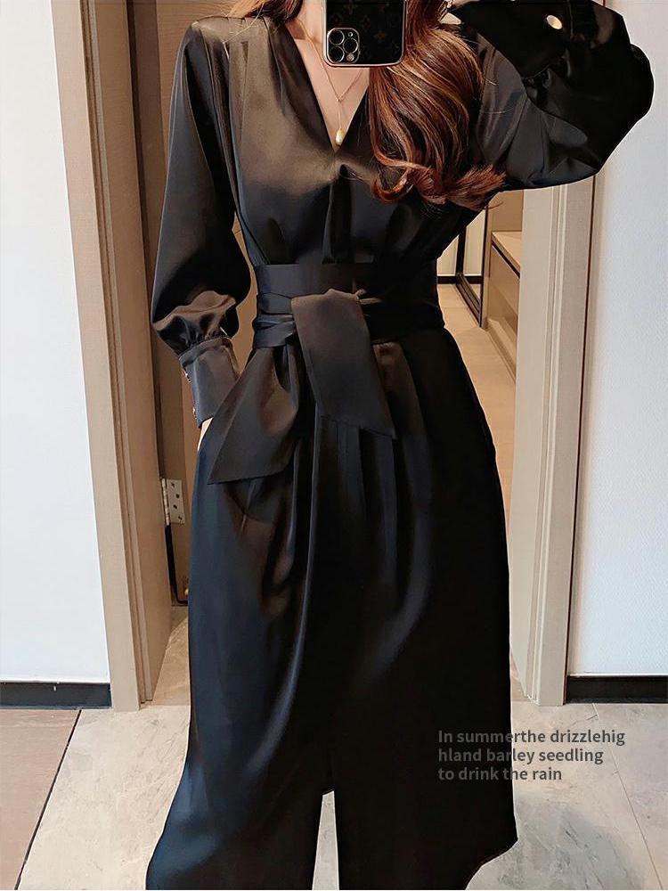 Vネック ワンピース ドレス ウエストリボン ハイウエスト パフスリーブ 2カラー a156