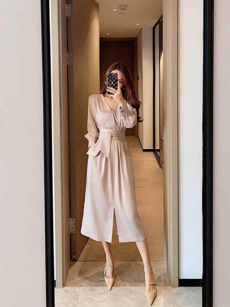 深めのVネックと太めのウエストリボンが大人キレイなワンピース