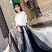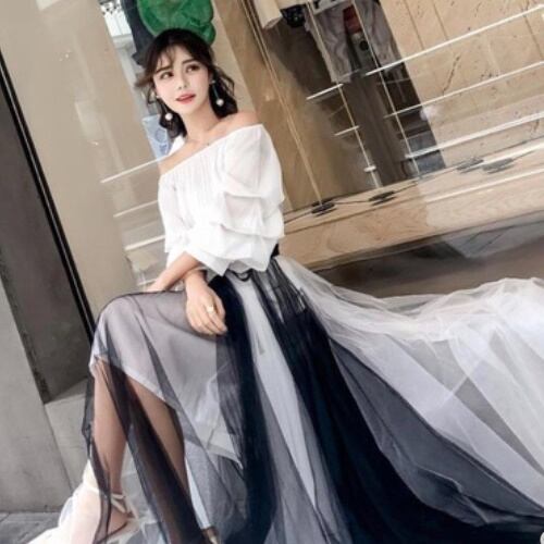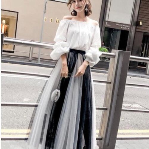 シック ふんわり配色 ウエストゴム チュールレース マキシロング A1009