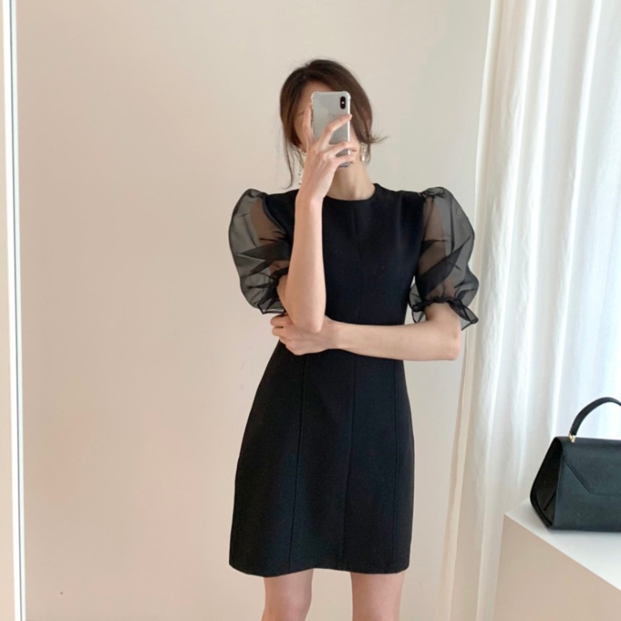 【日本未発売】ラウンドネック シフォンドレス ハイウエスト ミドル丈 パフスリーブ 韓国 a525