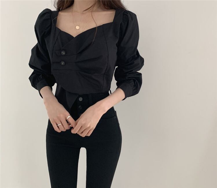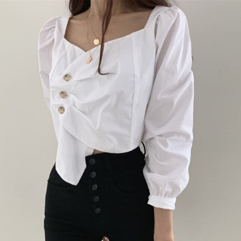 アシメントリー ブラウス シャツ 長袖 ショート丈 パフスリーブ デザイン 3カラー a537