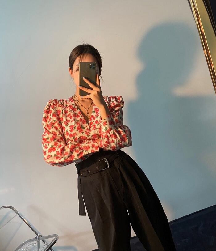 深めのVネックにフラワープリントが可愛いショート丈ブラウス