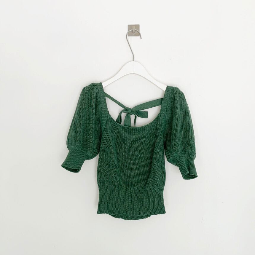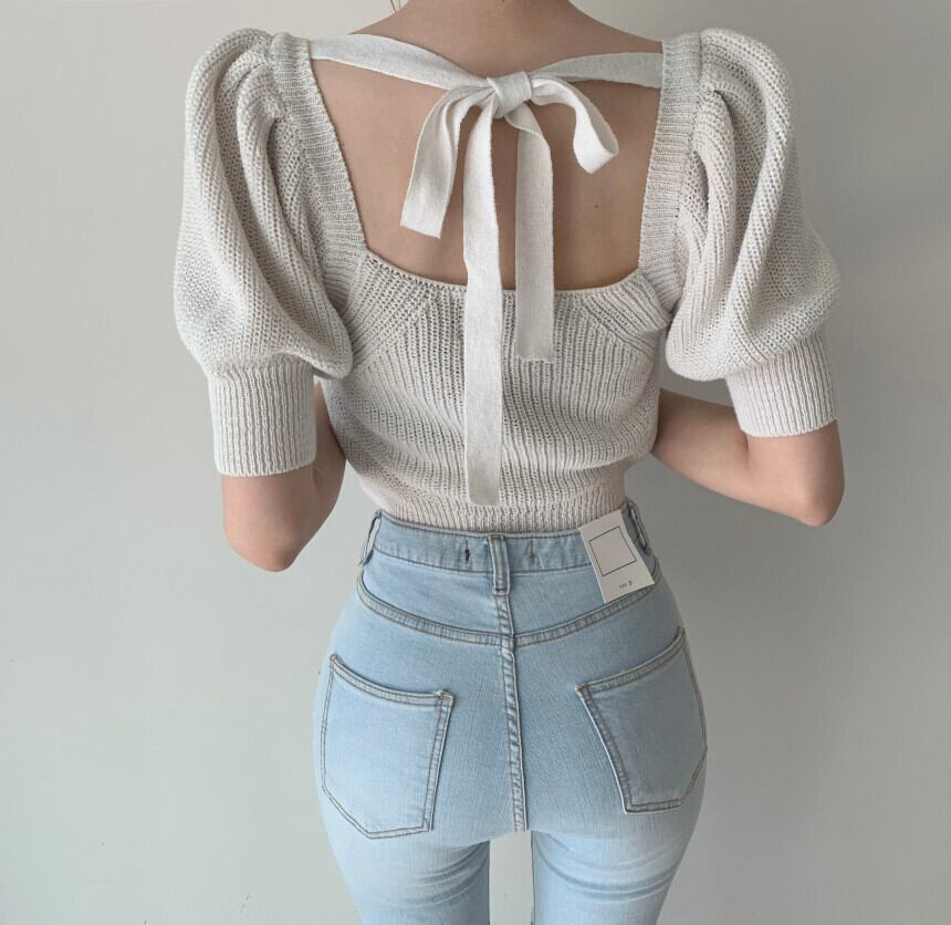 スクエアネック ニット バックリボン スリム パフスリーブ セーター Tシャツ 韓国 3カラー a203