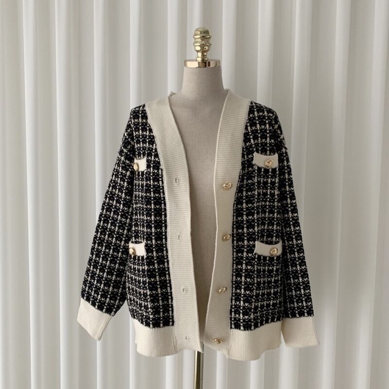 ツイード シングルブレスト チェッカー ニット カーディガン 長袖セーター ジャケット 2カラー a191