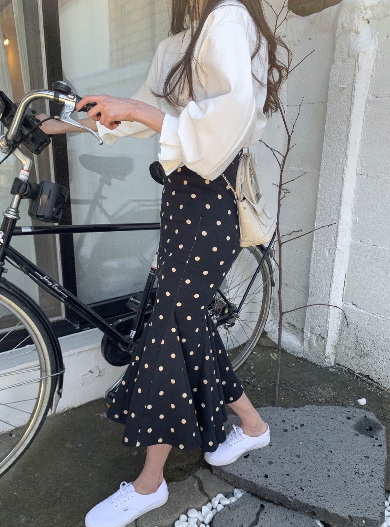 【セットアップ】トップス+マーメイドスカート ツーピース ハイウエスト パフスリーブ ドット柄 a321