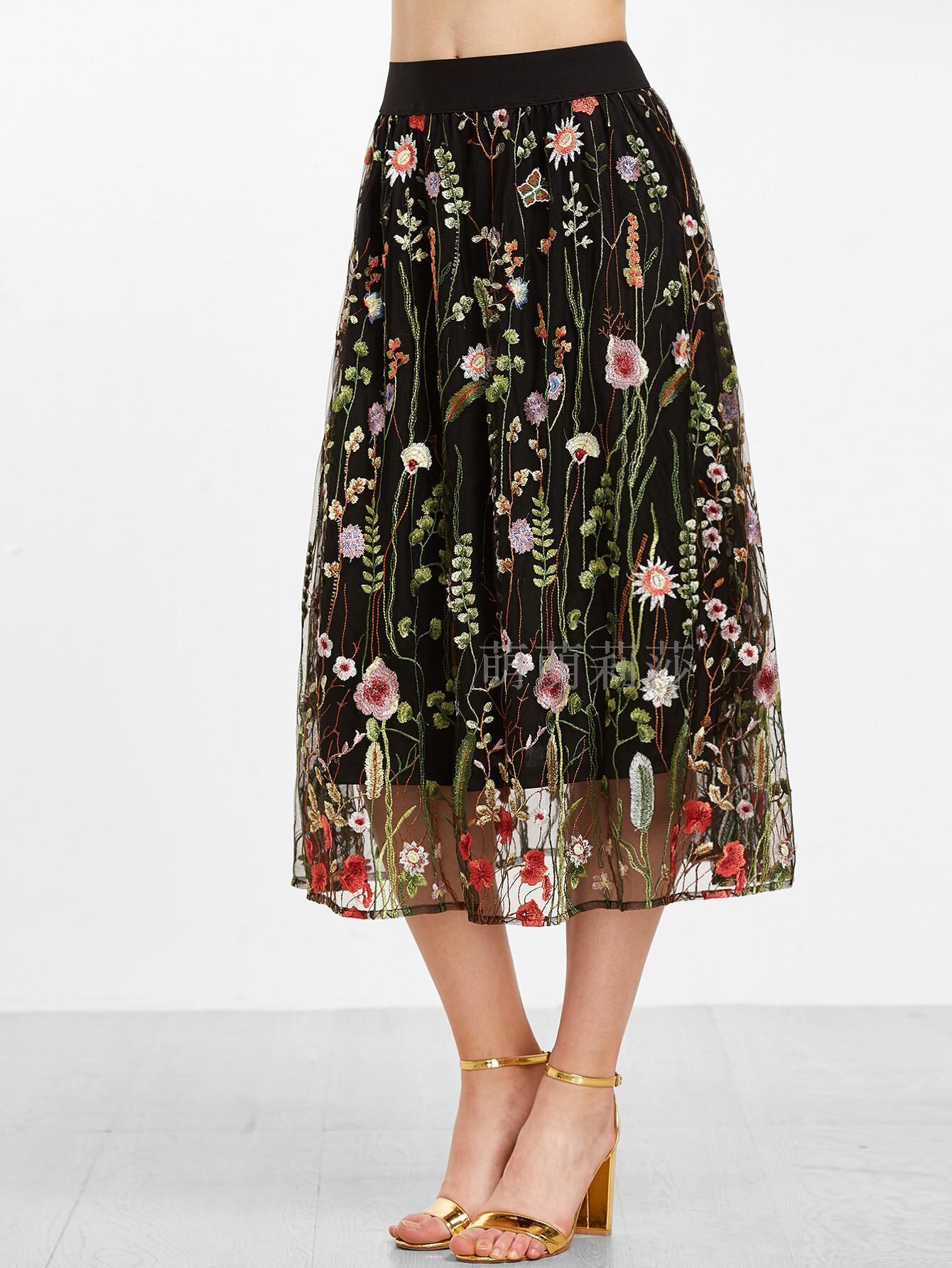 スカート フレアスカート ひざ下 刺繍 花柄 透け メッシュ A1074