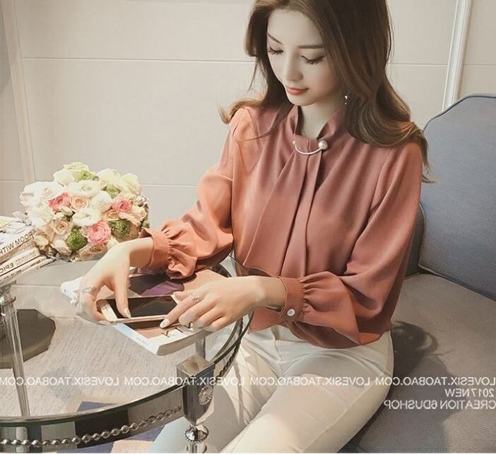 ボウタイ シフォンブラウス シャツ ラウンドネック 長袖 4カラー a811