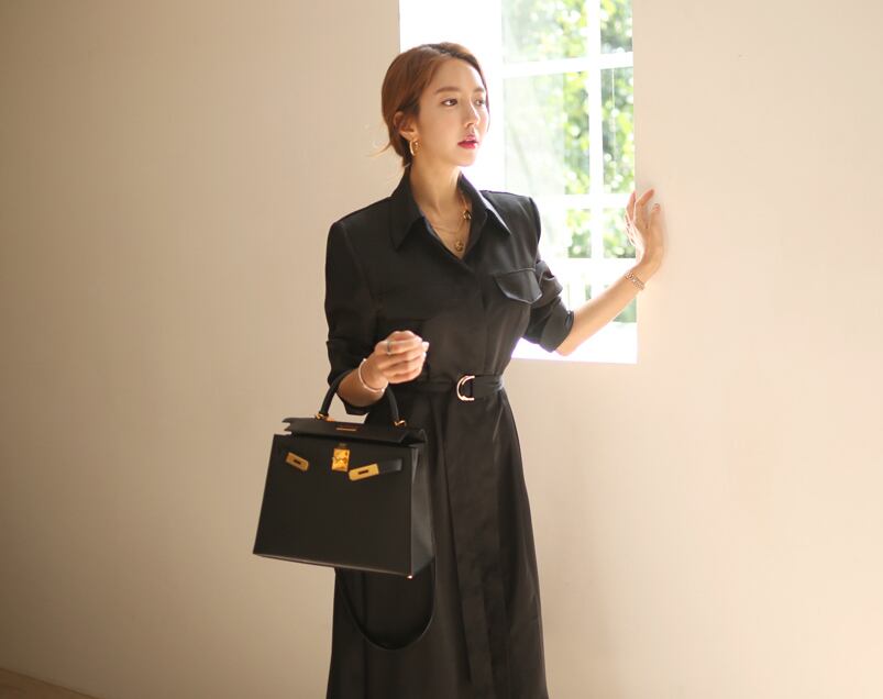 シャツワンピース シンプル ひざ丈 ウエストベルト きれいめ ☆A1111