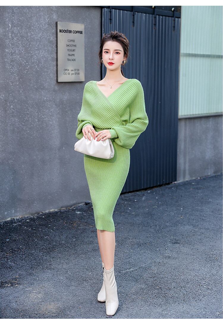 【セットアップ】Vネックネック+タイトニットスカート ニット おしゃれ バックスタイル きれいめ ☆A1116