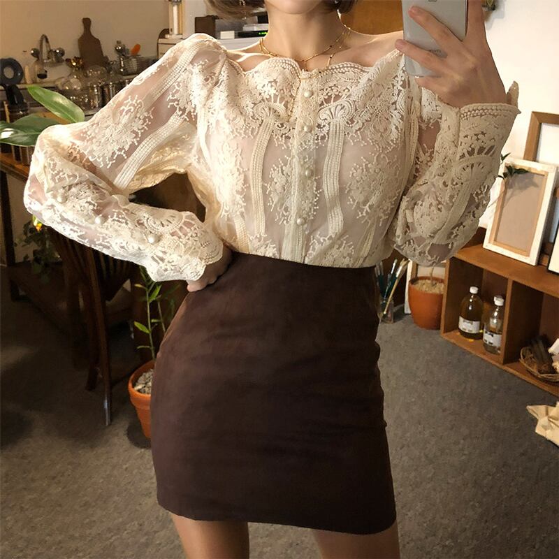 長袖ブラウス ボートネック インナーあり ゆるシルエット 透かし彫り トップス A693