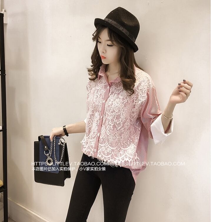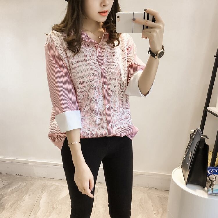 ストライプにレースデザインがオシャレな長袖シャツ