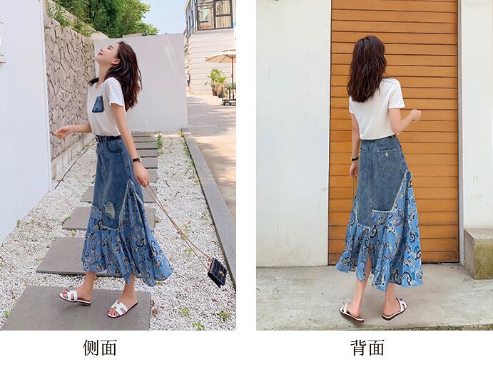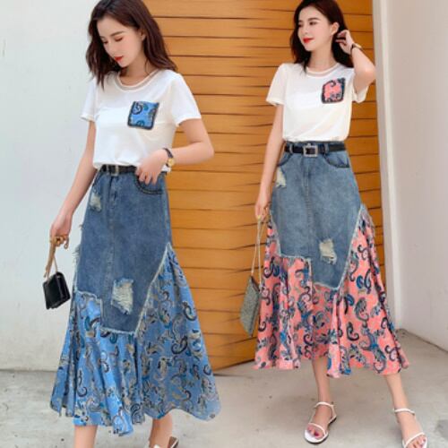デニム×バンダナデザインが綺麗なミモレ丈のデニムスカート