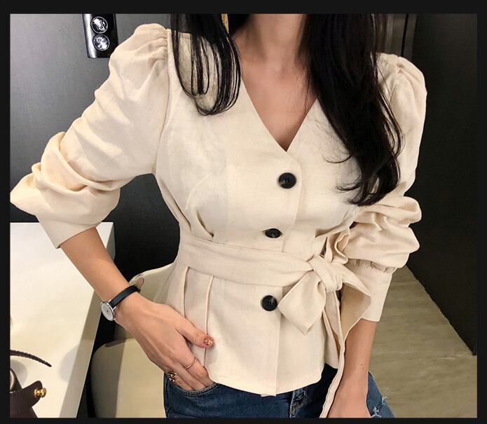 Vネック 長袖 ウエストフリル オールマッチ トップス☆A1152