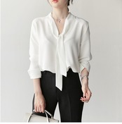 ボウタイVネックホワイトシフォンシャツ