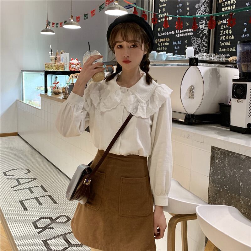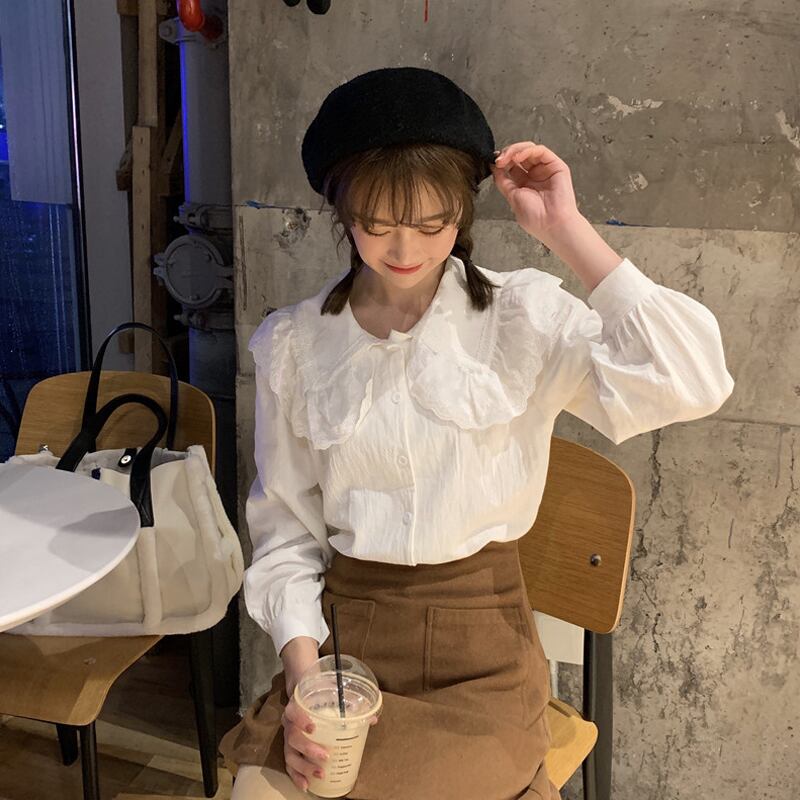 ワイドレース丸襟 ロリータブラウス キュートなスタイル 長袖 白A716