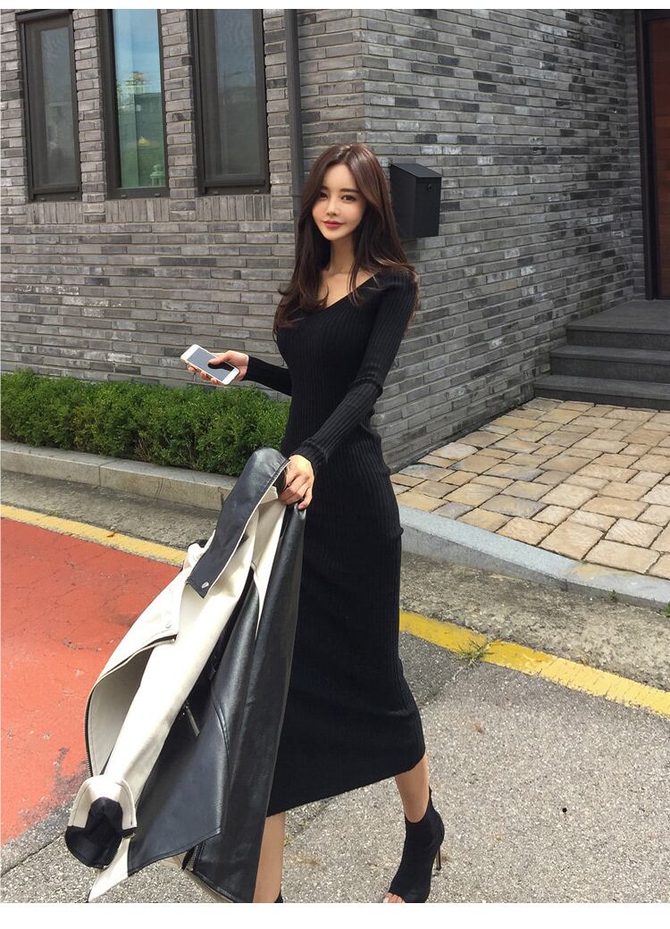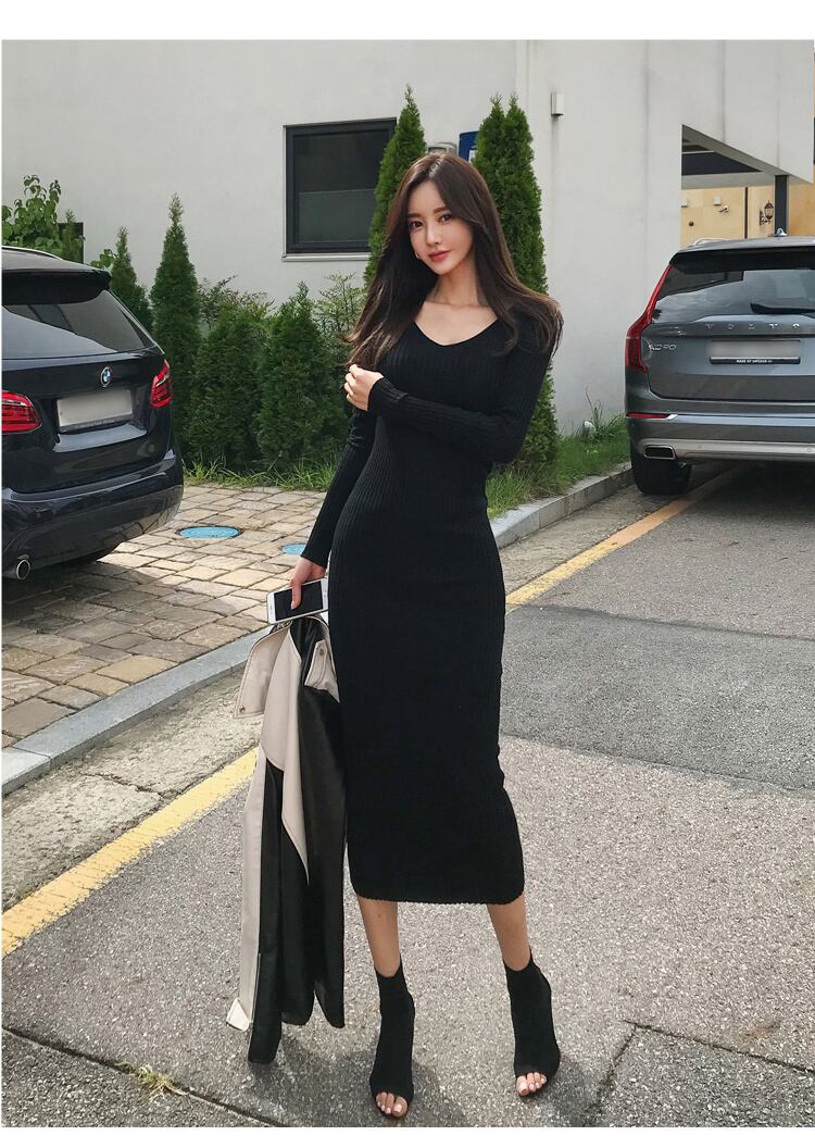 Vネック 長袖 ニット ワンピース ドレス ロングスカート タイト a857