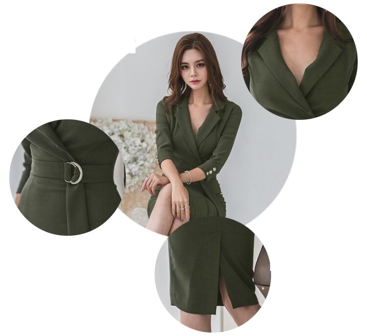 スーツネック 七分袖 ウエストベルト バッグヒップ ドレス ミドル丈 a881
