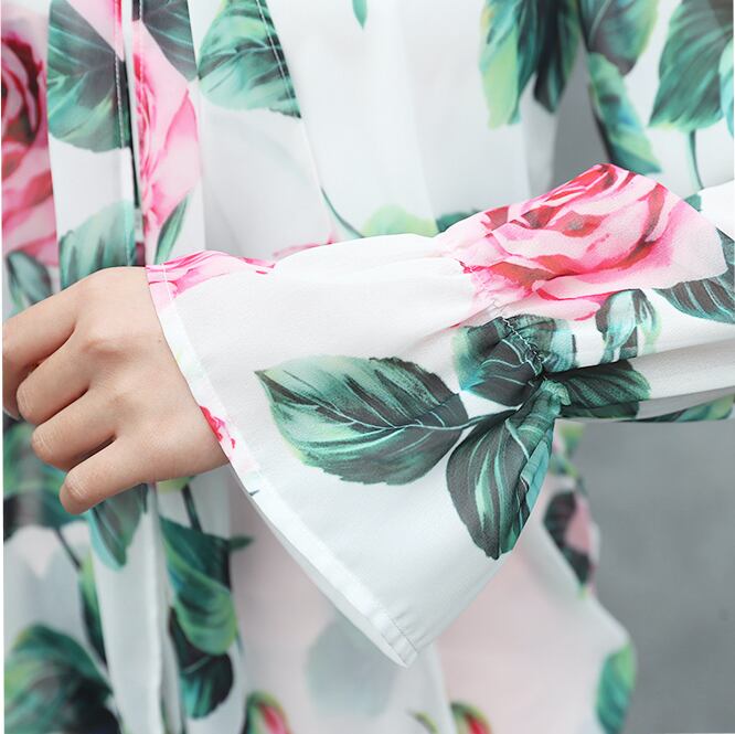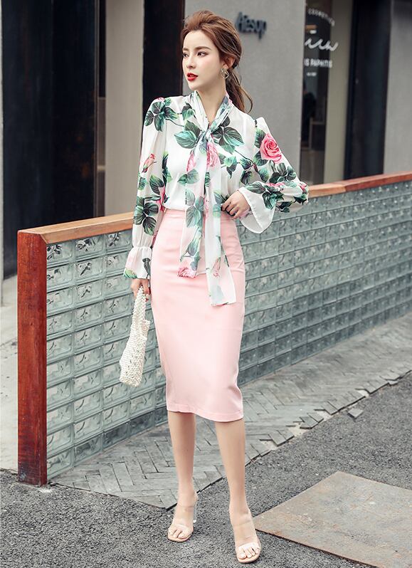 【セットアップ】リボンシフォンブラウス+スプリットスカート ハイウエスト フラワープリント ツーピース a884