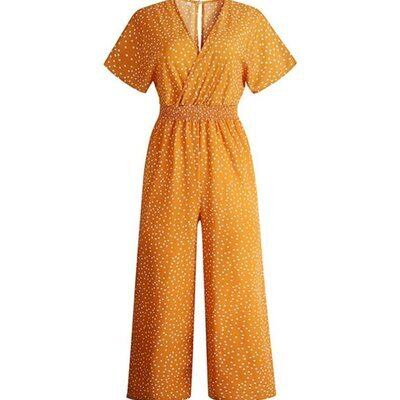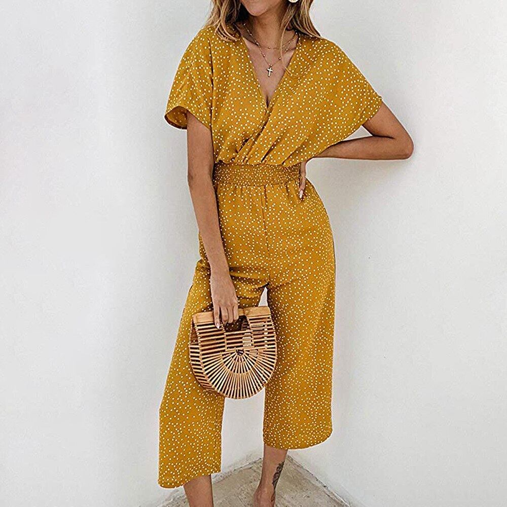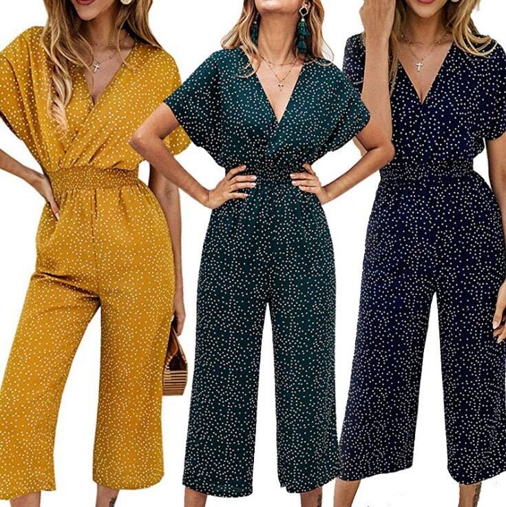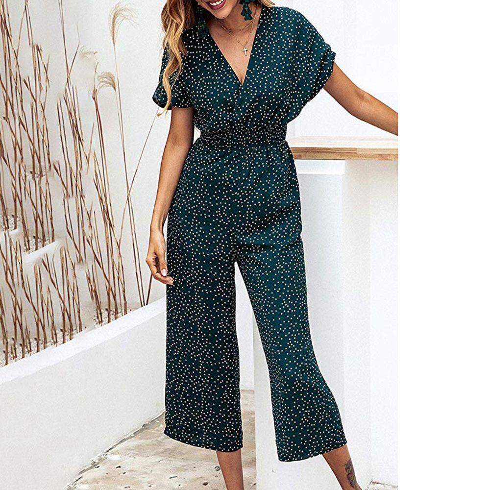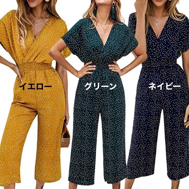 9分丈 ジャンプスーツ ドット柄 Vネック 伸縮性ウエスト 3カラー A764