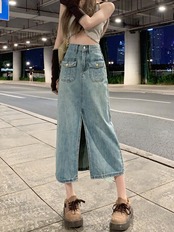 デニムスカート スカート デニム 可愛い ミドル丈スカート Aライン ハイウエスト フロントスリット 韓国 レディース A930