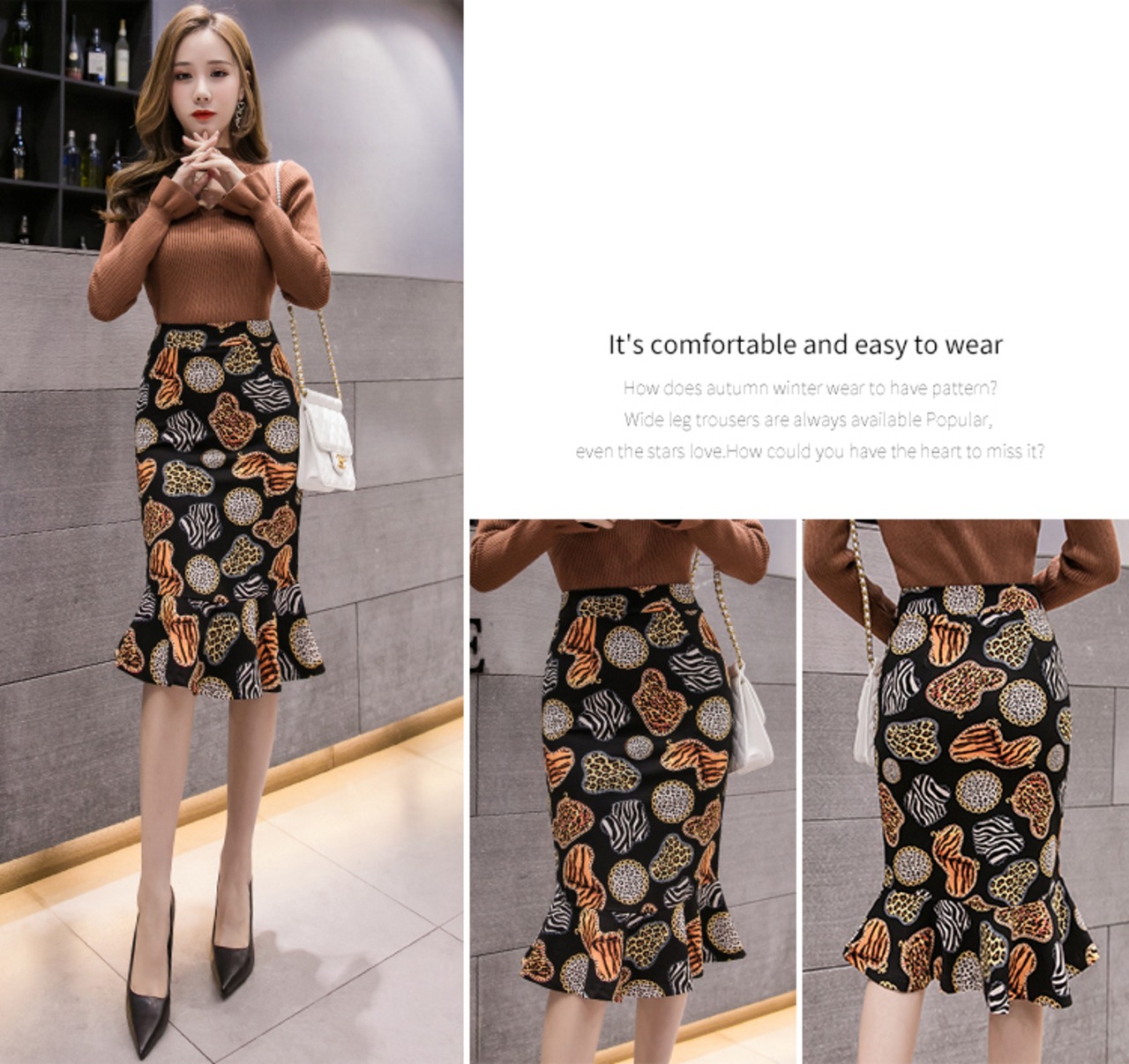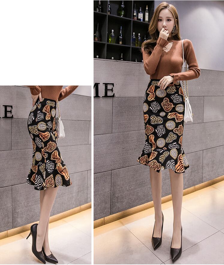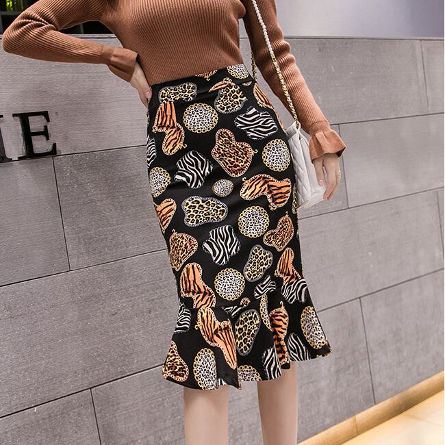 ヒョウ柄プリントスカート フリル ハイウエスト フィッシュテールスカート マーメイド a1066