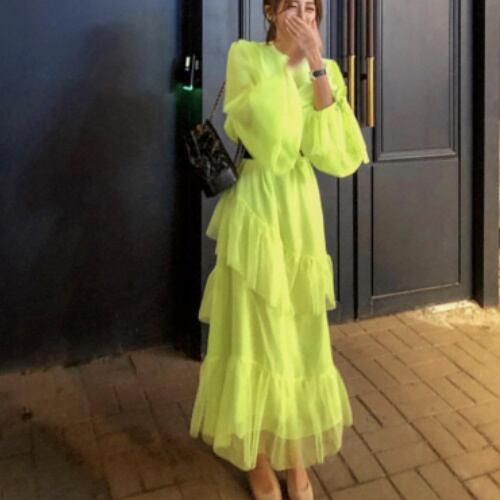 長袖ワンピース シフォン素材 透け感 ワンピース A1291