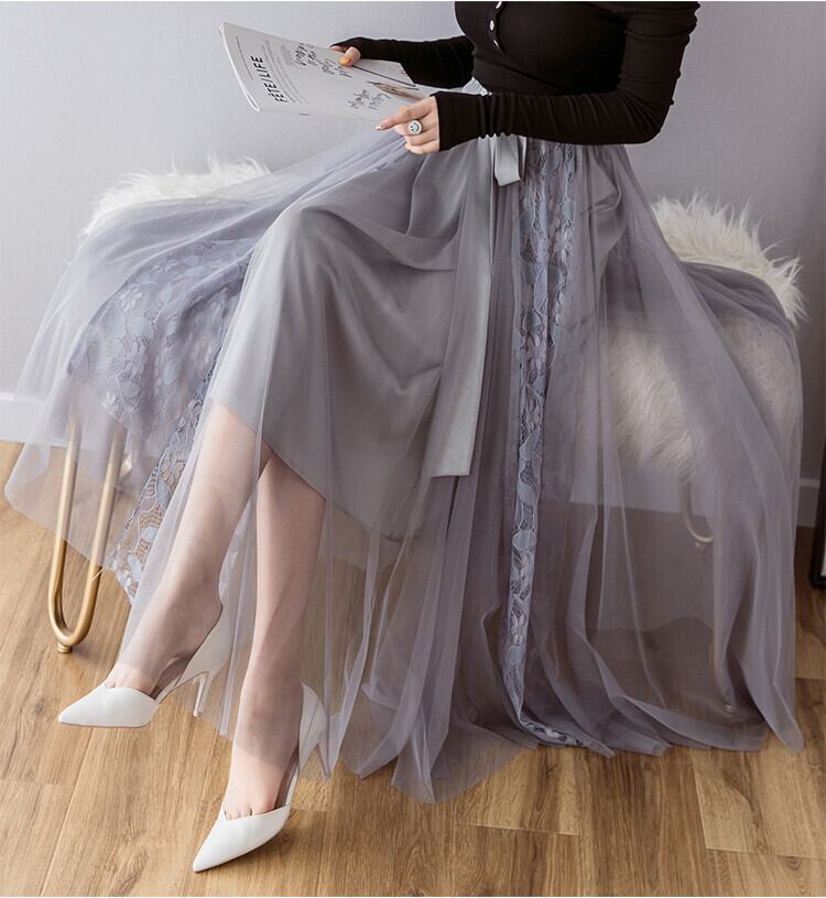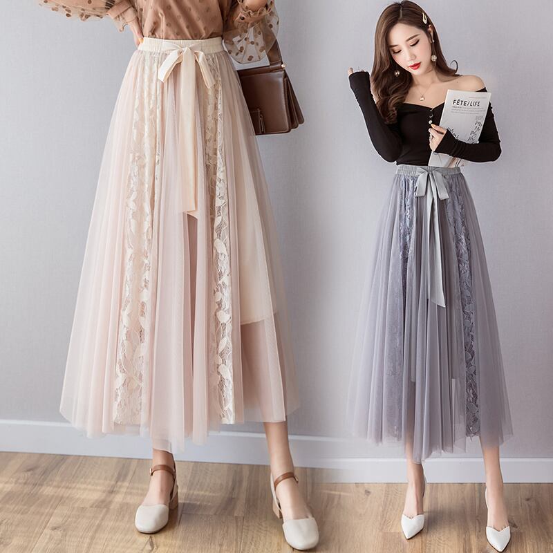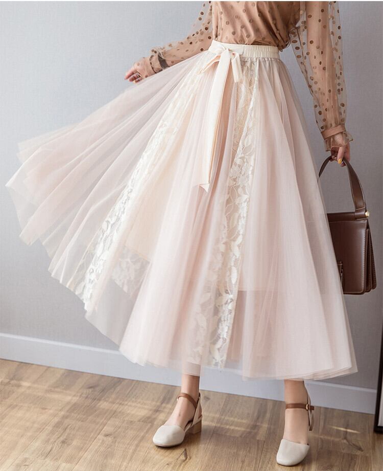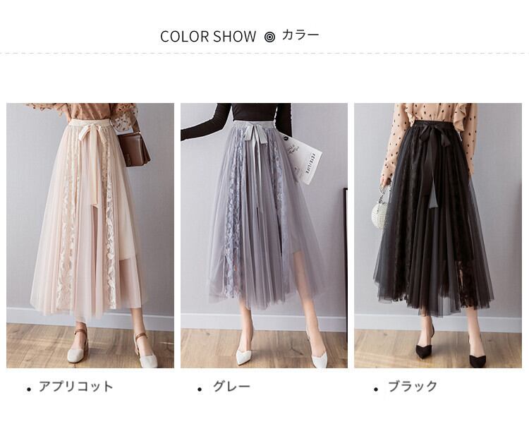 Aラインレースステッチメッシュスカート ウエストリボン 3カラー a1378