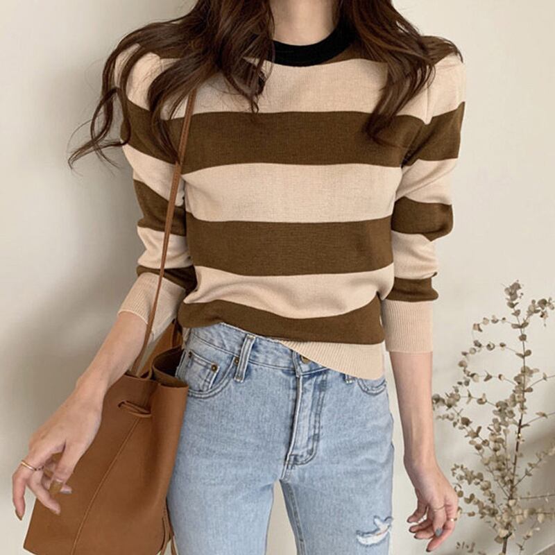 ラウンドネック ボーダースリムフィット長袖セーター 3カラー a1386