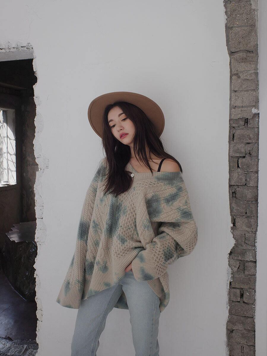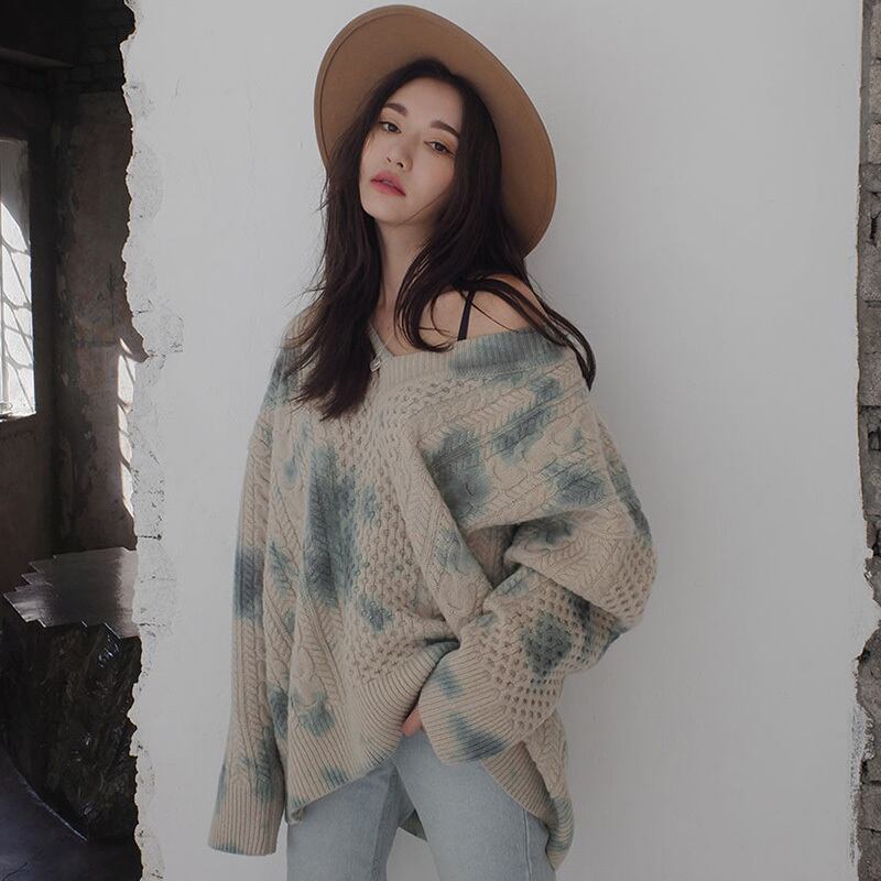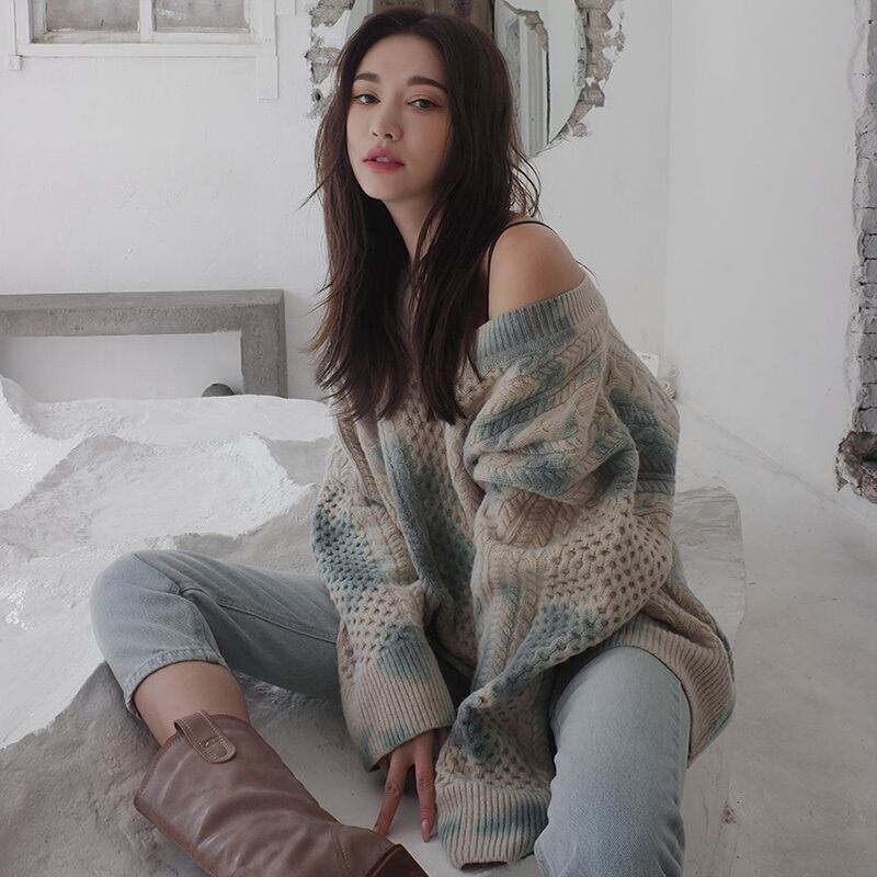 Vネックルーズ長袖セーター アシメントリー 2カラー a1391