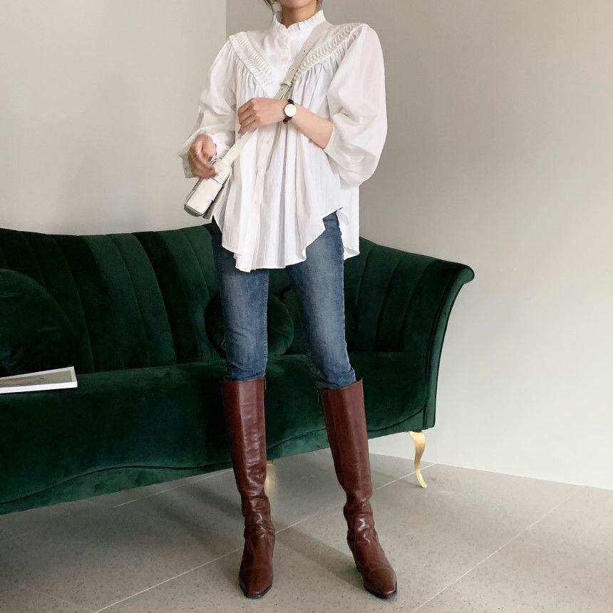 ランタンスリーブとスタンドカラーが可愛いルーズシャツ