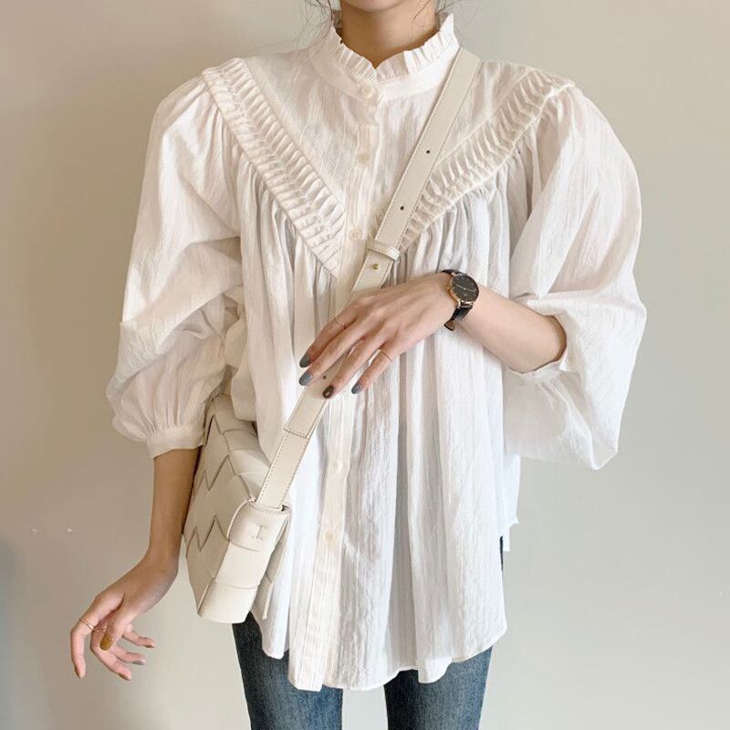 ランタンスリーブシャツ プリーツ 刺繍 シングルブレスト ルーズ 2カラー a1392