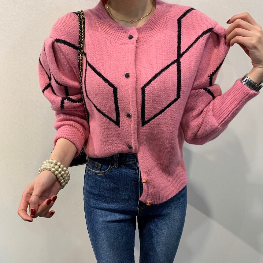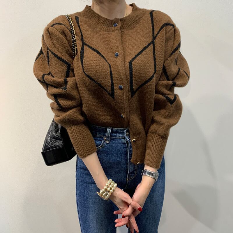 幾何学柄カーディガンセーター 長袖 ラウンドネック シングルブレスト 4カラー a1413
