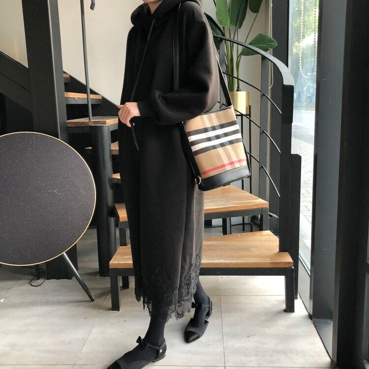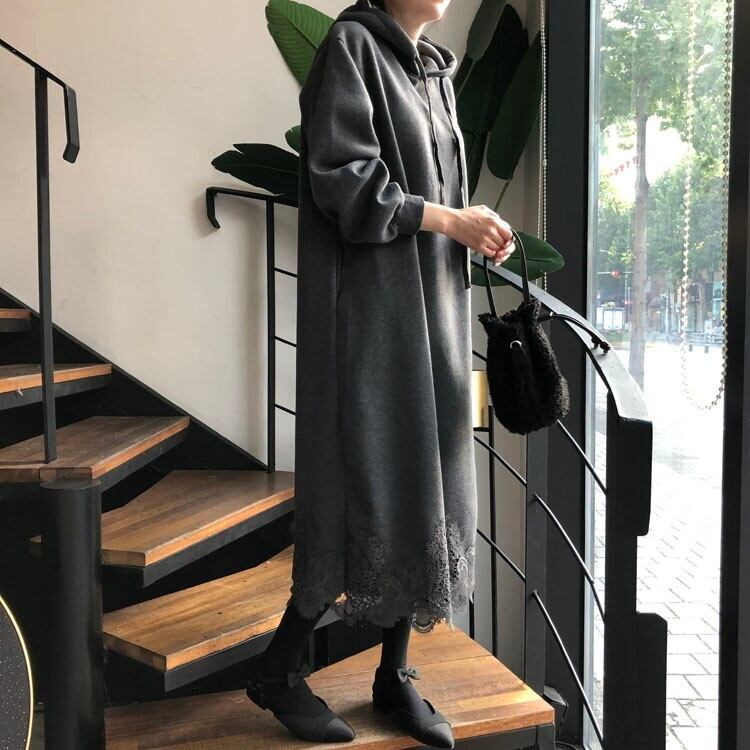フード付きセーターワンピース レースステッチ ベルベット 韓国 オルチャン 3カラー a1417