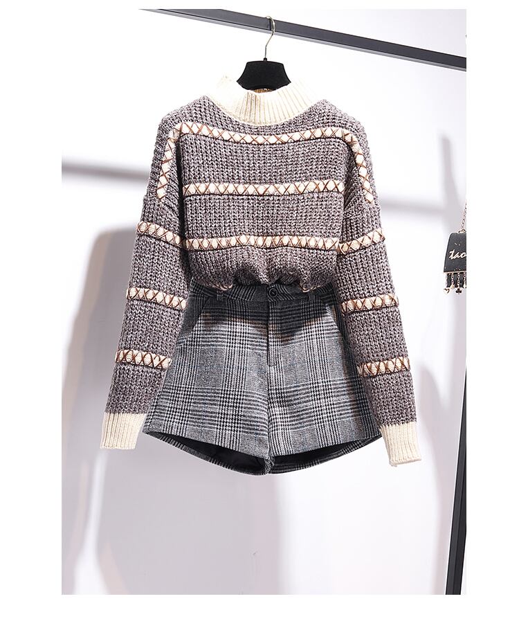 【セットアップ】セーター+ショートパンツ グレンチェック ハイウエスト ツーピース 2カラー a1438