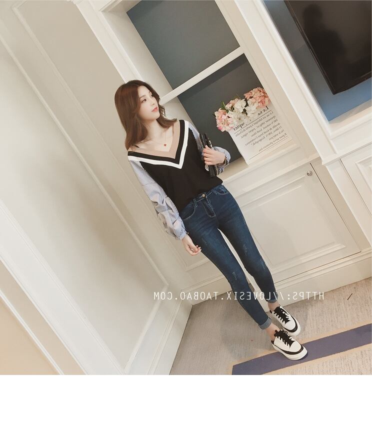 Vネックトップス バールーン袖 ストライプ 2カラー C3