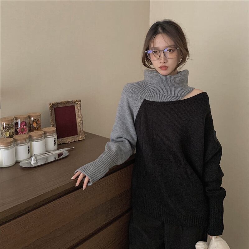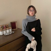 ハイネックカラー ニット セーター マッチングツーウェア ルーズ レイジー 長袖 韓国 3カラー a1452