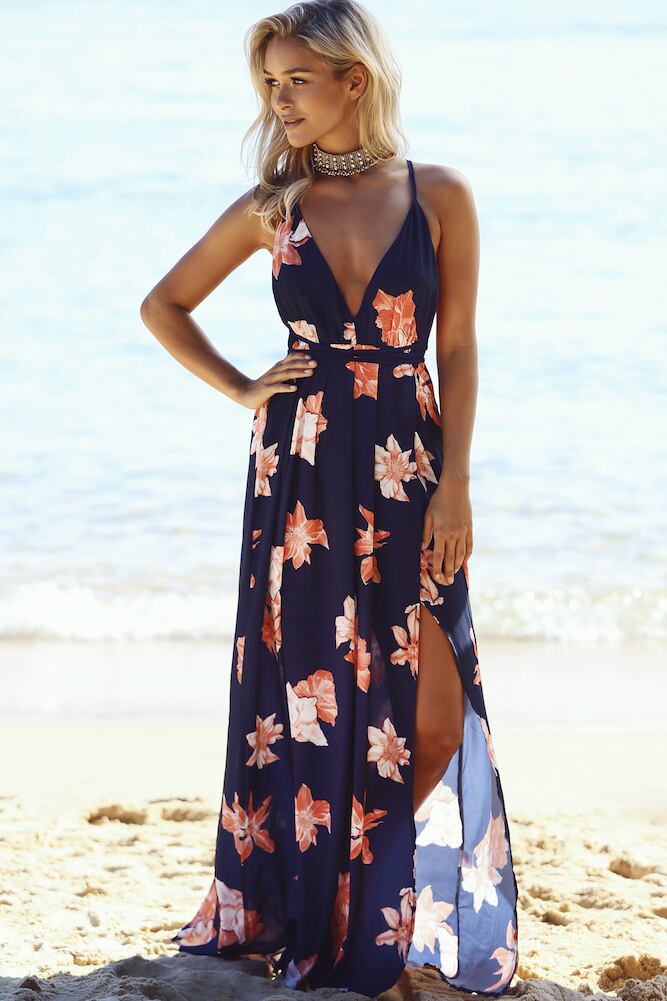 キャミソールワンピース サマードレス キャミソール バッククロス スリット フラワープリント a1451