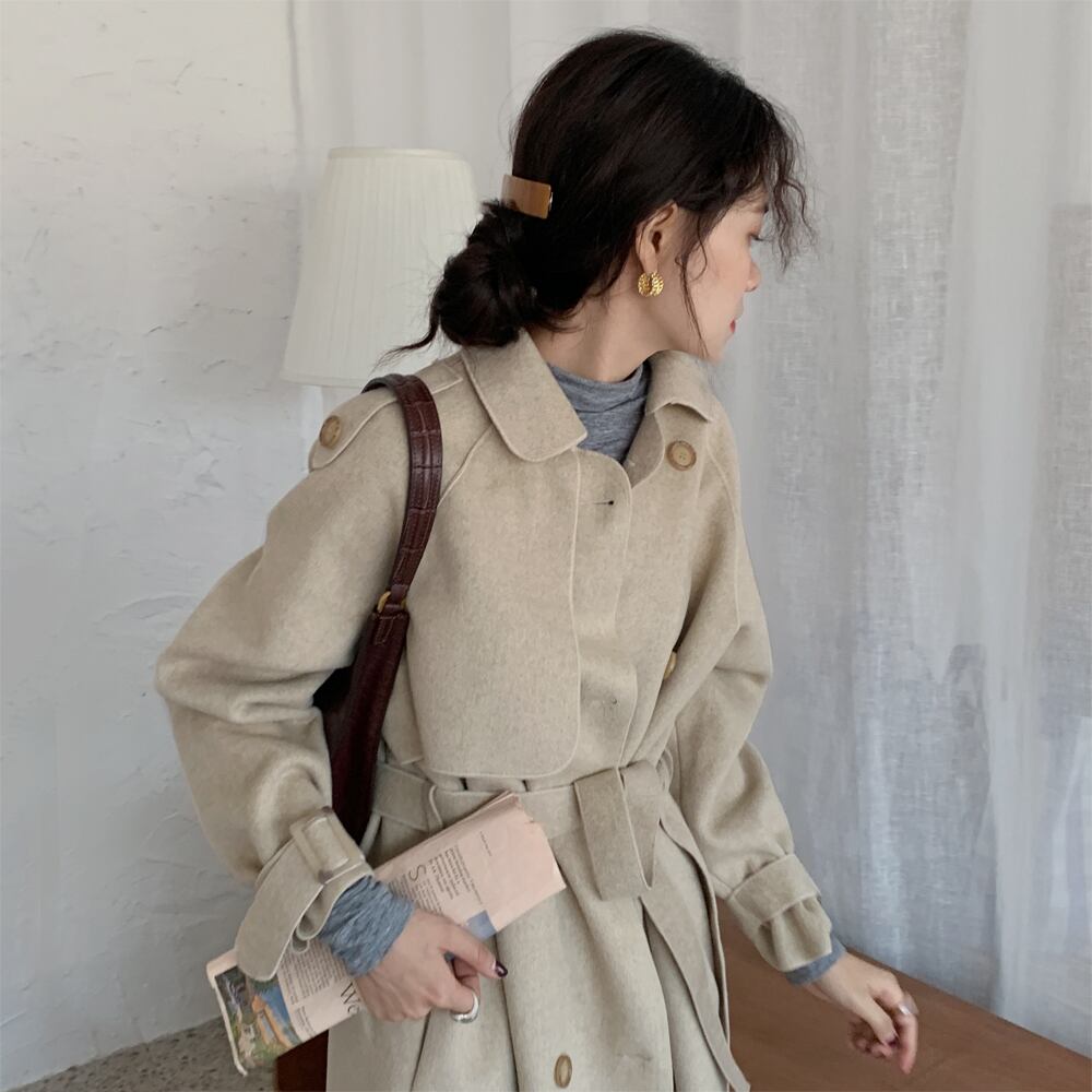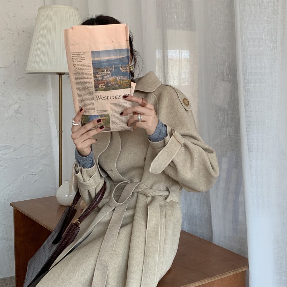 ウールコート コート レトロラペル ダブルブレスト レースアップ ウエストリボン 韓国 2カラー a1473