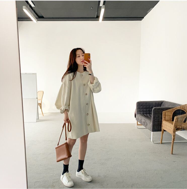 パフスリーブ ワンピース ミッドドレス ラウンドネック シングルブレスト ルーズ 韓国 ピュアカラー ワイルド シンプル a1478
