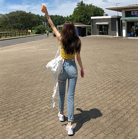 後太もも穴あきジーンズレディース ハイウエスト タイトカット A895