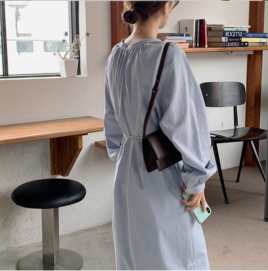カジュアルシャツワンピース ウエストリボン ランタンスリーブ ラウンドネック シングルブレスト ルーズ 韓国 2カラー a1499